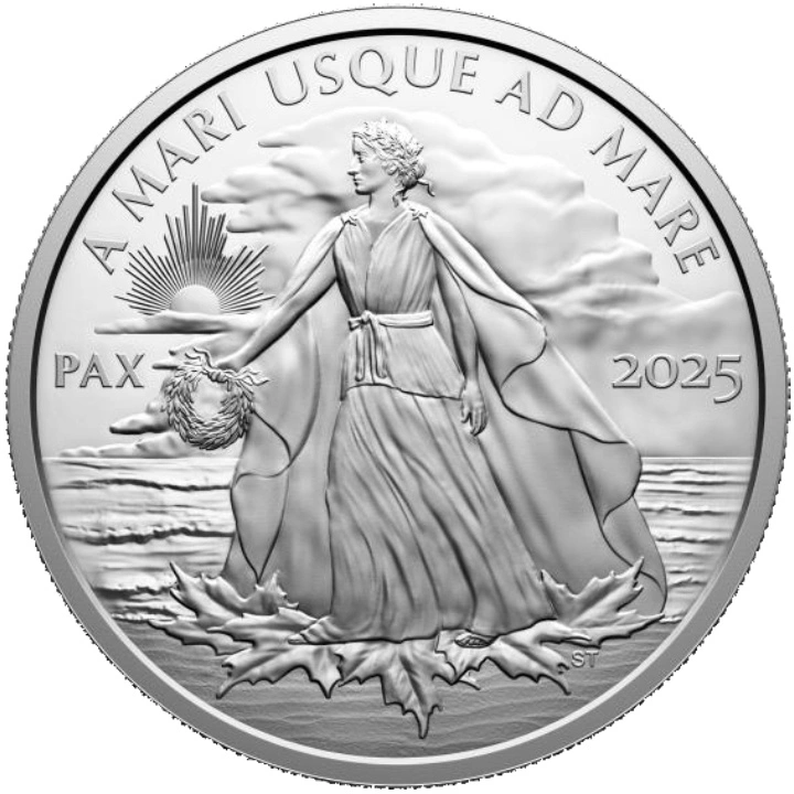 Canada: Peace Dollar 5 uncji Srebra 2025 Proof przedstawia nową interpretację "Dolara Pokoju" nawiązującego do ciągłego zaangażowania Kanady w powszechne prawa człowieka i pokój na świecie. Zanim Lester B. Pearson został premierem Kanady, otrzymał w 1957 roku Pokojową Nagrodę Nobla za zorganizowanie pierwszych sił pokojowych ONZ