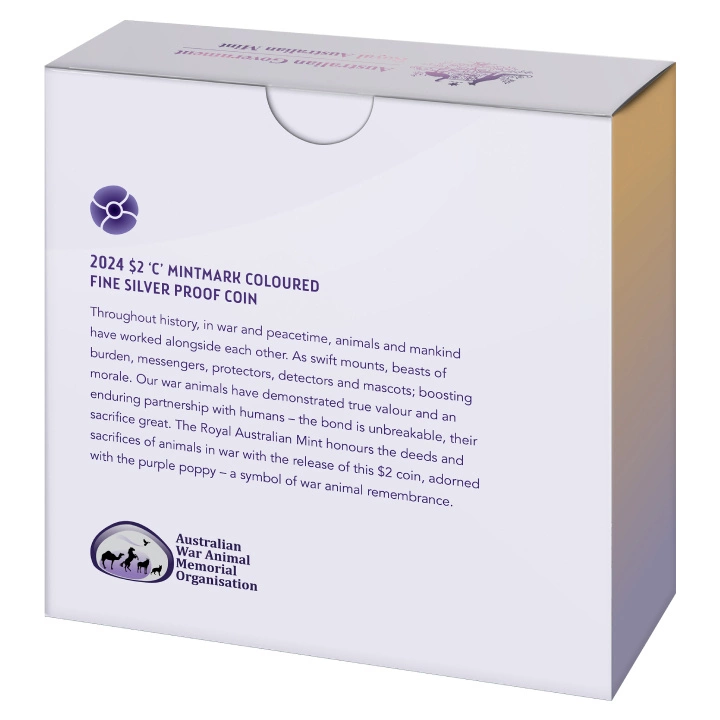 RAM: War Animals Remembrance kolorowany $2 Srebro 2024 Proof "C" Mintmark to ciekawa propozycja inwestycyjna, która może wzbogacić portfolio kolekcjonera. Walor jest wzruszającym symbolem odwagi i służby zwierząt, które towarzyszyły żołnierzom podczas wojen.