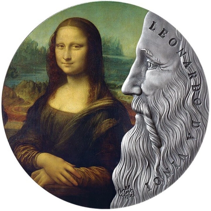 Ghana: World's Greatest Artists - Leonardo da Vinci kolorowany 2 uncje Srebra 2019 High Relief Antiqued Coin to wyjątkowa moneta, która oddaje hołd jednemu z najwybitniejszych artystów w historii ludzkości. Na walorze tym upamiętniono geniusza Renesansu, Leonarda da Vinci, w niezwykle szczegółowy sposób.