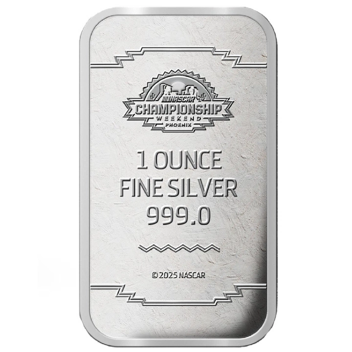 Awers sztabki przedstawia oficjalne logo NASCAR Cup Series wraz z klasycznymi oznaczeniami wagi i czystości srebra.