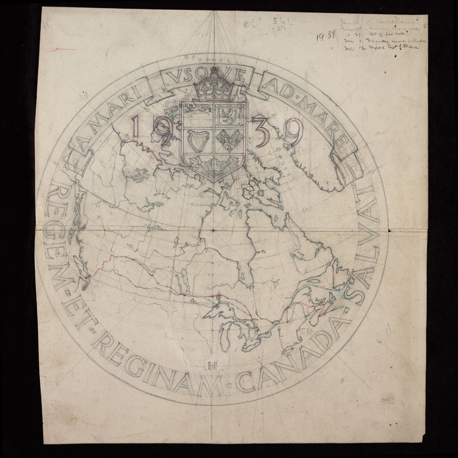 Rewers ukazuje ręczny szkic mapy Kanady z trasą królewskiej podróży z 1939 roku, wykonany przez Emanuela Hahna, wraz z historyczną inskrypcją i odwzorowanymi detalami kartograficznymi oraz śladami złożenia papieru.