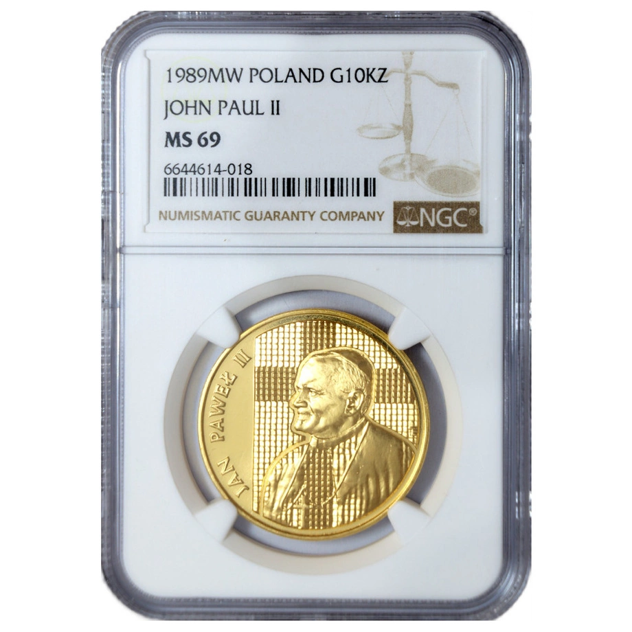 Jan Paweł II 1 uncja Złota 1989 Proof MS 69 to wyjątkowa polska moneta kolekcjonerska, wybita w najwyższej jakości menniczej z okazji pontyfikatu papieża Jana Pawła II. Emisja ta ma szczególne znaczenie historyczne i duchowe – ukazuje postać papieża-Polaka jako symbol wolności, nadziei oraz siły moralnej, szczególnie w przełomowym roku 1989. Moneta została wybita w czystym złocie próby .999, ma masę 31,1 g (1 uncja trojańska), średnicę 32 mm i standard proof. Charakteryzuje się doskonałym stanem zachowania – MS 69, ocenionym przez niezależną firmę gradingową. Taki stopień zachowania oznacza niemal idealny stan, z minimalnymi, niemal niedostrzegalnymi niedoskonałościami widocznymi tylko pod lupą. Ta złota moneta stanowi doskonałe połączenie wartości kolekcjonerskiej, inwestycyjnej i duchowej. Ze względu na niską emisję i unikalny temat cieszy się dużym zainteresowaniem wśród kolekcjonerów monet papieskich oraz polskich emisji historycznych. Awers: Przedstawia godło Polskiej Rzeczypospolitej Ludowej – Orła Białego, otoczonego napisem „POLSKA RZECZPOSPOLITA LUDOWA” oraz nominałem „10 000 ZŁ”. Na awersie widnieje także rok emisji – 1989. Rewers: Ukazuje popiersie Jana Pawła II na tle krat, co symbolicznie nawiązuje do duchowego przebudzenia i pokonywania zniewolenia. W otoku znajduje się napis „JAN PAWEŁ II”. Projekt wzbudza refleksję nad ówczesną sytuacją polityczną i rolą papieża w przemianach społecznych.