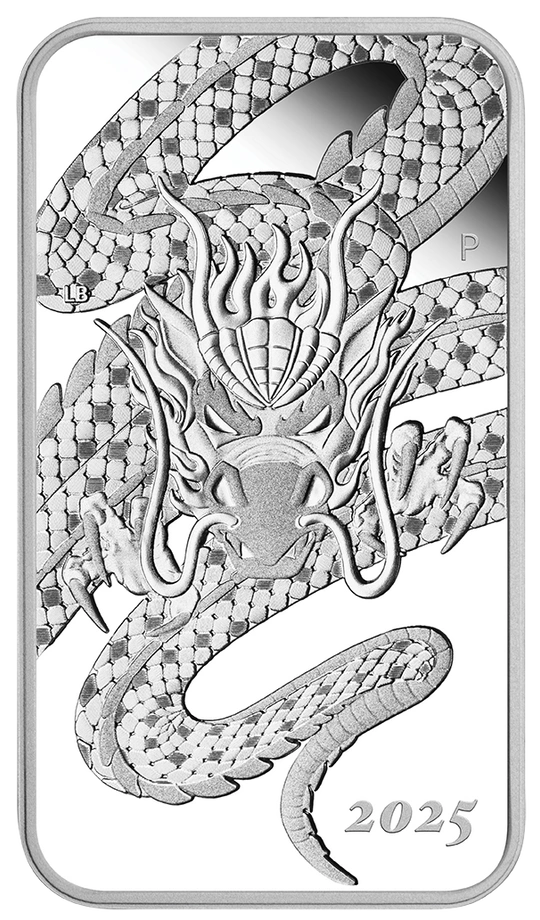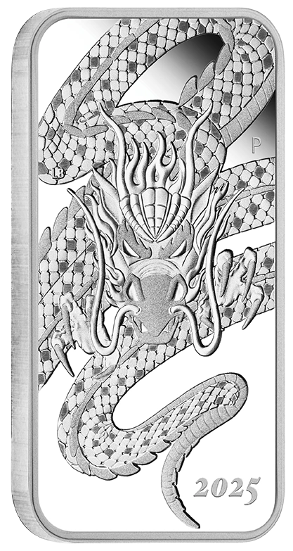 Rewers: Centralnym punktem projektu jest wizerunek orientalnego smoka — mitycznego stworzenia o ogromnym znaczeniu kulturowym. W tradycji wschodniej smok to symbol siły, mądrości i szczęścia. Przedstawiony w dynamicznej pozie, smok prezentuje rozwinięte pazury i szczegółowo odwzorowane łuski oraz skrzydła. Całość kompozycji uzupełnia napis „2025” oraz znak menniczy Perth Mint – litera „P”. Projekt rewersu opracował Lucas Bowers.
