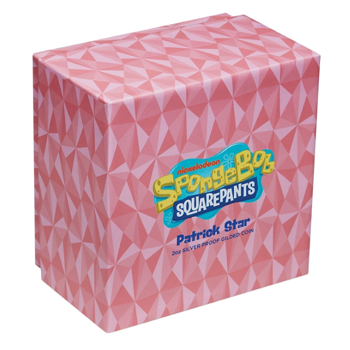 SpongeBob SquarePants – Patrick Star pozłacany 2 uncje Srebra 2025 Proof to wyjątkowa kolekcjonerska moneta, która zabiera nas do podwodnego świata Bikini Dolnego – miejsca pełnego barwnych postaci i nieprzewidywalnych przygód. Centralną postacią tej edycji jest Patrick Star – różowa rozgwiazda i najlepszy przyjaciel SpongeBoba. Choć często bywa naiwny i niezdarny, to jego niespodziewane przebłyski geniuszu oraz urok osobisty sprawiają, że trudno go nie polubić. Rewers: przedstawia uśmiechniętego Patryka w pozłacanym różowym wykończeniu (22-karatowe różowe złoto), na tle graficznych motywów inspirowanych podwodnym światem i wzorami rozgwiazd. Na monecie widnieje również oficjalne logo "SpongeBob SquarePants". Projekt rewersu autorstwa Jennifer McKenny doskonale oddaje kreskówkowy klimat serii. Awers: ukazuje wizerunek Króla Karola III, zaprojektowany przez Jody'ego Clarka. Umieszczony jest on centralnie na gładkim tle, typowym dla monet z emisji wyspiarskich państw Pacyfiku. Projekt awersu uzupełniają informacje o emitencie, roku emisji, wartości nominalnej oraz wadze i i czystości kruszcu. Moneta została wykonana z czystego srebra próby 9999, waży 2 uncje trojańskie i ma średnicę 50,8 mm. Całość umieszczono w kolorowym opakowaniu nawiązującym do domu Patryka, a każda sztuka jest opatrzona numerowanym certyfikatem autentyczności. Limitowany nakład wynosi zaledwie 1000 egzemplarzy.