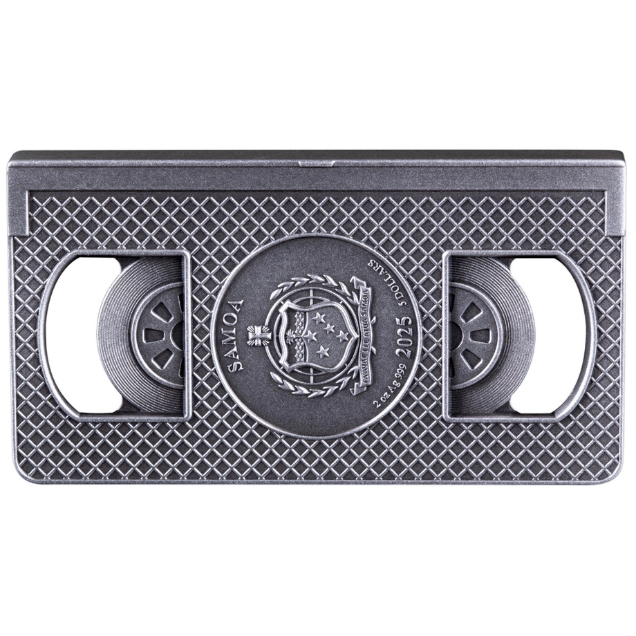 Rewers: ukazuje tylną stronę kasety VHS, z charakterystycznymi detalami odwzorowującymi rzeczywisty wygląd magnetycznej taśmy. W centralnym punkcie kasety znajduje się herb Samoa oraz informacje o roku emisji, wartości nominalnej oraz wadze i czystości kruszcu.