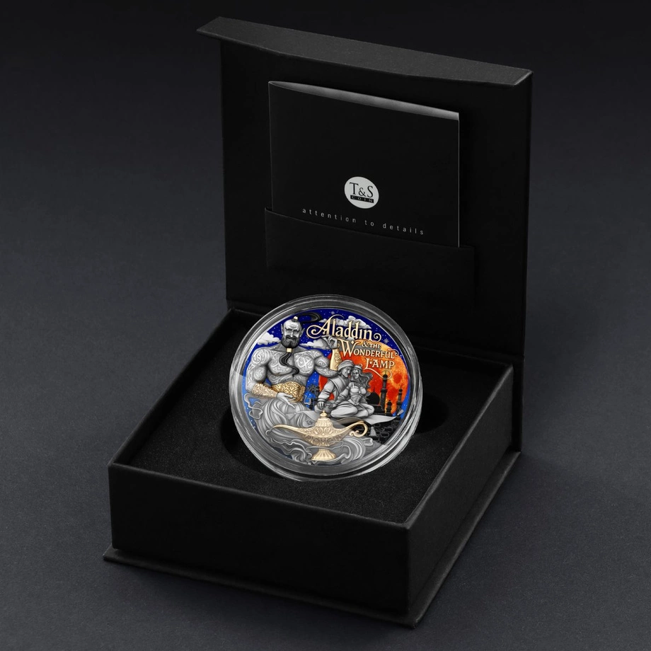 Niue: Aladdin & the Wonderful Lamp kolorowany/pozłacany 2 uncje Srebra 2025 Antiqued Coin to druga moneta z serii „Fabulous Stories”, która w mistrzowski sposób ukazuje magiczną opowieść o przygodach Aladyna w orientalnym świecie pełnym tajemnic i przygód. Po sukcesie poprzedniej emisji inspirowanej „Piękną i Bestią”, ta moneta zachwyca selektywnym złoceniem i precyzyjnym drukiem UV, które nadają projektowi niezwykłą głębię i barwę. To kolekcjonerskie dzieło sztuki łączy tradycję z nowoczesnością, oddając hołd ponadczasowej baśni o marzeniach, odwadze i przemianie. Limitowany nakład i eleganckie opakowanie podkreślają unikatowy charakter emisji.