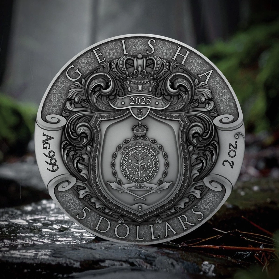 Niue: Geisha kolorowany/pozłacany 2 uncje Srebra 2025 Antiqued Coin to wyjątkowy numizmat inspirowany tradycyjną japońską kulturą, będący hołdem dla subtelnej siły i wdzięku gejszy. Postać gejszy – strażniczki tradycji, uosobienia spokoju, kunsztu i elegancji – została ukazana z niezwykłą dbałością o detale i symbolikę. Jej obecność przypomina, że prawdziwe piękno nie potrzebuje słów, a największa moc często kryje się w ciszy i precyzyjnie wyważonym geście.