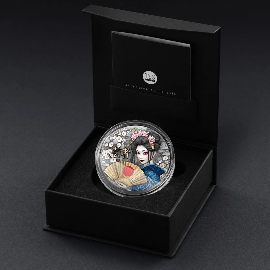 Awers: przedstawia herb Niue wraz z rokiem emisji – 2025. Poniżej umieszczono wartość nominalną monety, a po jej bokach znajdują się oznaczenia dotyczące wagi i czystości srebra. Całość uzupełnia napis „GEISHA”, umieszczony w górnej części awersu, nadający kompozycji tematyczny charakter. Projekt zachowuje równowagę między klasycznym stylem monet obiegowych a artystyczną formą kolekcjonerską. Rewers: ukazuje kolorowaną scenę z gejszą trzymającą w dłoni ozdobny wachlarz. Jej twarz emanuje spokojem i skupieniem, a pozłacany wachlarz z motywem czerwonego słońca staje się zarówno narzędziem wyrazu, jak i symbolem tradycji. Detale stroju oraz kwiatowe zdobienia – w tym różowe lilie – zostały przedstawione z niezwykłą precyzją, podkreślając finezję oraz wewnętrzną siłę bohaterki. Artystyczna kompozycja łączy statyczną elegancję z bogatą symboliką, przenosząc odbiorcę do świata, w którym harmonia i piękno współistnieją w doskonałej równowadze.