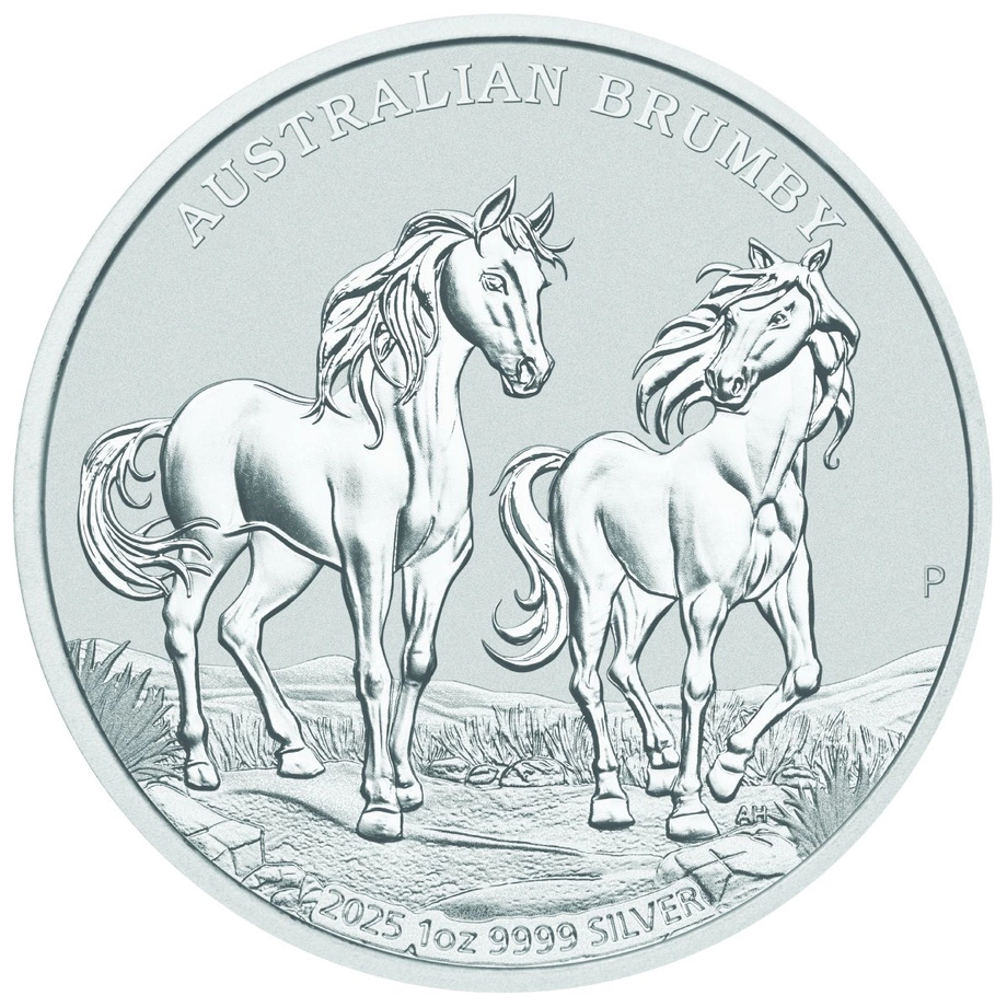 Rewers: dwa dzikie konie Brumby na tle suchego, australijskiego krajobrazu. U góry znajduje się napis „AUSTRALIAN BRUMBY”, a na dole rok emisji oraz informacje o wadze i czystości kruszcu. Po prawej stronie umieszczony został znak mennicy "P".