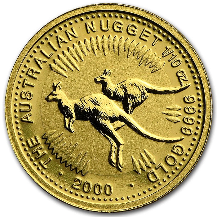Australia: Australijski Kangur – Samorodek 1/10 uncji Złota 2000 to złota moneta bulionowa wybita przez renomowaną mennicę Perth Mint. Seria Gold Nugget, znana także jako Kangur, jest produkowana od 1989 roku i charakteryzuje się bardzo wysoką próbą złota – 0,9999. Moneta ta łączy wartość inwestycyjną z atrakcyjnym wzornictwem, które zmienia się co roku, co podnosi jej wartość numizmatyczną.