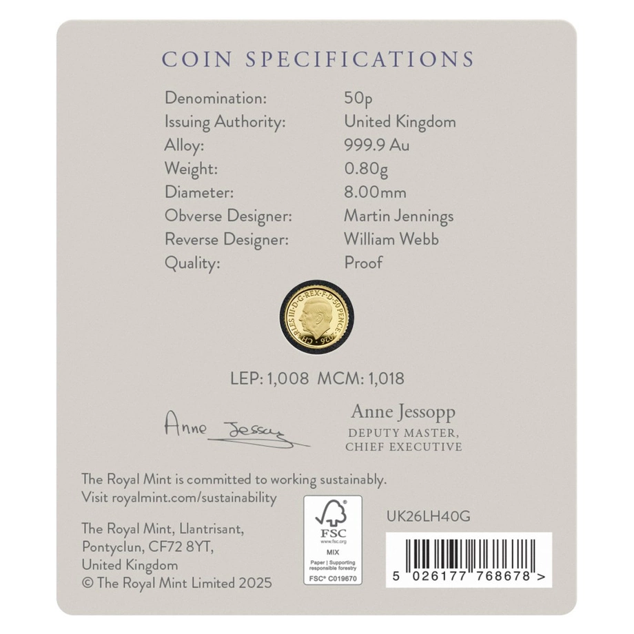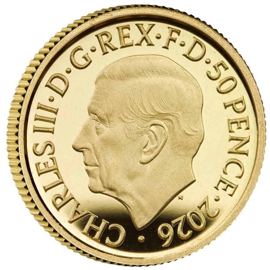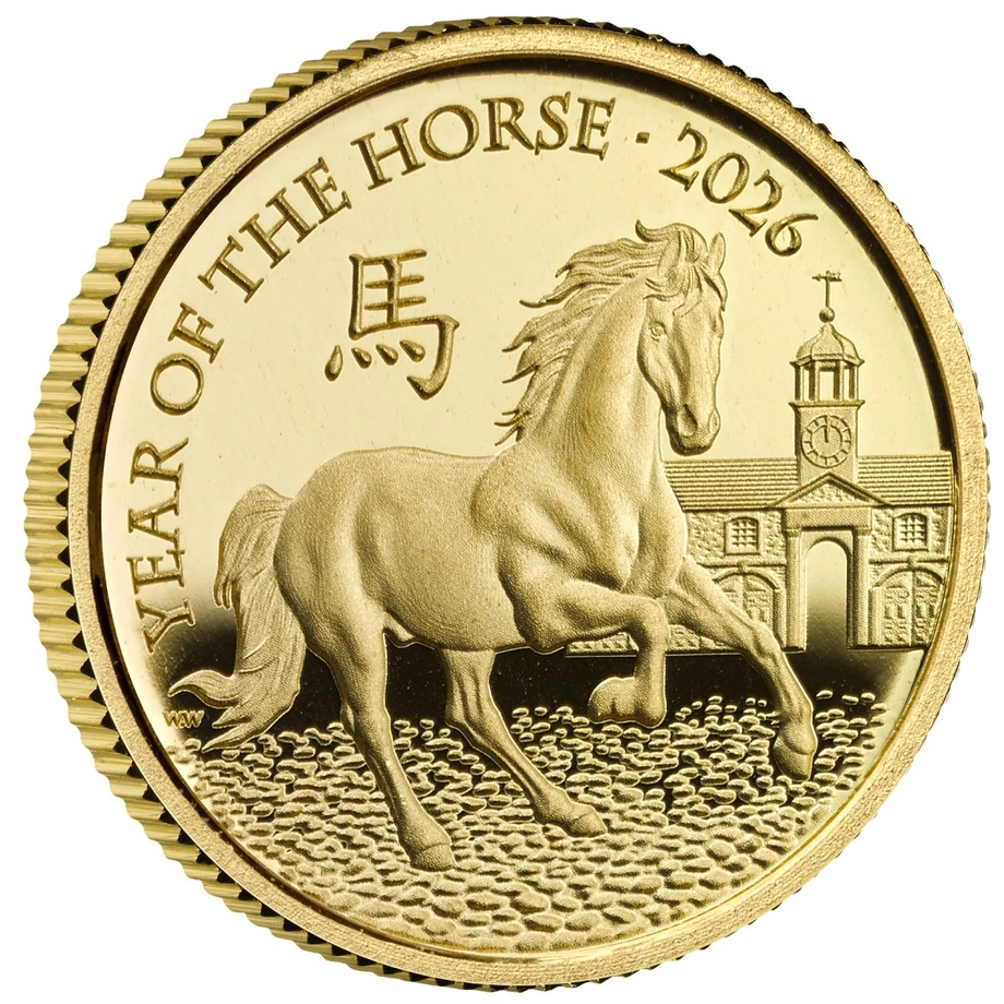Moneta została wykonana z 0,8 grama złota próby .9999 w standardzie proof. Jej średnica wynosi 8,00 mm, a nominał to 50 pensów brytyjskich. Limitowany nakład wynosi zaledwie 1 008 sztuk, co czyni ją rzadkim i wyjątkowym egzemplarzem dla kolekcjonerów. Rewers autorstwa Williama Webba przedstawia konia w dynamicznym ujęciu na tle miejskiej scenerii, z napisem „YEAR OF THE HORSE 2026” oraz chińskim znakiem symbolizującym Rok Konia.