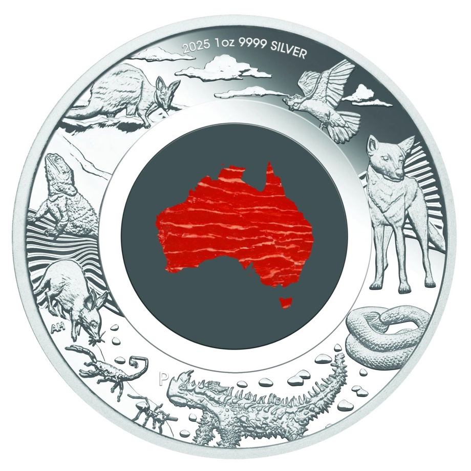 Rewers przedstawia australijskie zwierzęta pustynne ułożone wokół wstawki z jaspisu „snakeskin” w kształcie Australii. Jaspis ten, znany z czerwono-białych pasów i występujący w regionie Pilbara, symbolizuje naturalne bogactwo i unikalny charakter kontynentu. Wśród przedstawionych zwierząt znajdują się m.in. kakadu, dingo, tajpan, moloch straszliwy, mrówka pustynna, skorpion, bilbi, agama brodata i wallaby skalny. Tło rewersu uzupełniają elementy symbolizujące niebo, piasek i skały. Na rewersie znajduje się również znak mennicy „P”, waga i próba srebra oraz rok emisji – 2025.