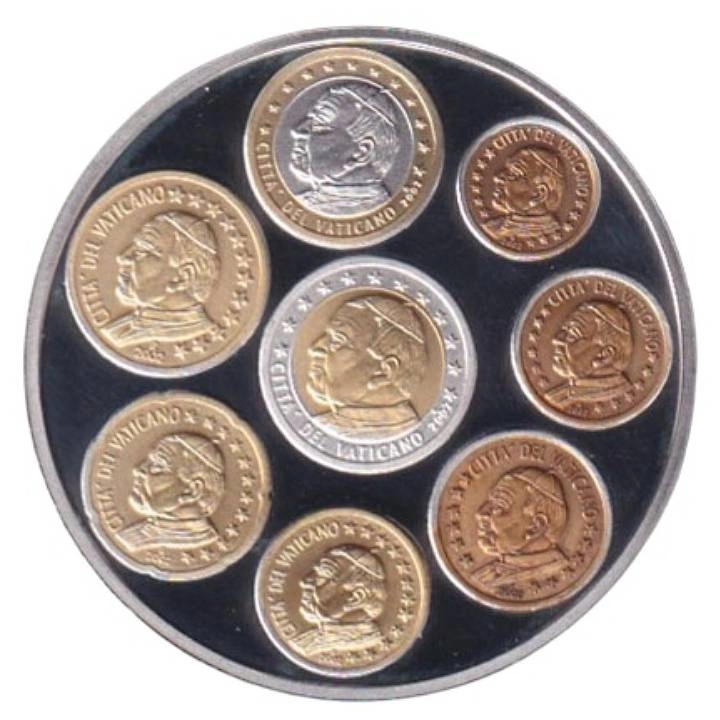 Awers monety prezentuje osiem monet euro o różnych nominałach, symbolizując wejście Watykanu do strefy euro oraz integrację Europy poprzez wspólną walutę. Detale kompozycji oddają symbolikę jedności i nowoczesności eurostrefy.