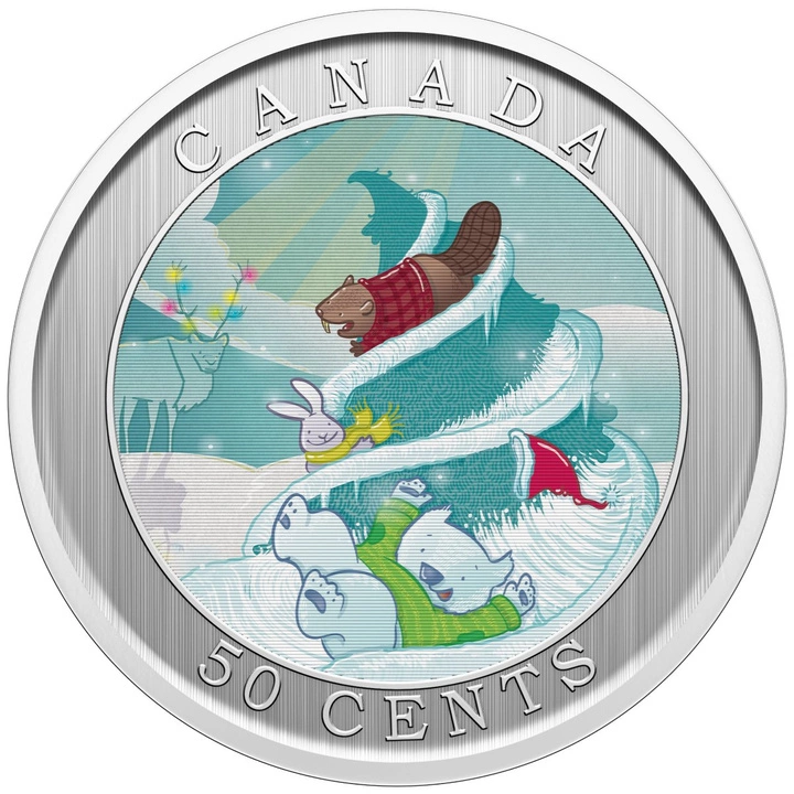 Rewers przedstawia lentikularny obraz wesołych kanadyjskich zwierząt, w tym niedźwiedzia polarnego Churchilla, które zjeżdżają ze ślizgawki, a obraz zmienia się przy ruchu monety, tworząc iluzję ruchu. Na tej stronie widnieje także napis „CANADA” oraz wartość nominalna „50 CENTS”.