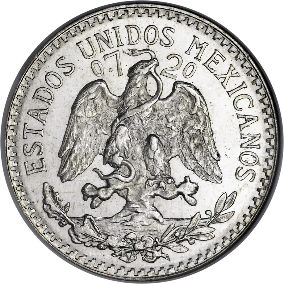Awers przedstawia orła z wężem, siedzącego na kaktusie – symbol narodowy Meksyku. Całość otacza napis „ESTADOS UNIDOS MEXICANOS” wraz z oznaczeniem próby srebra: „0.720”.