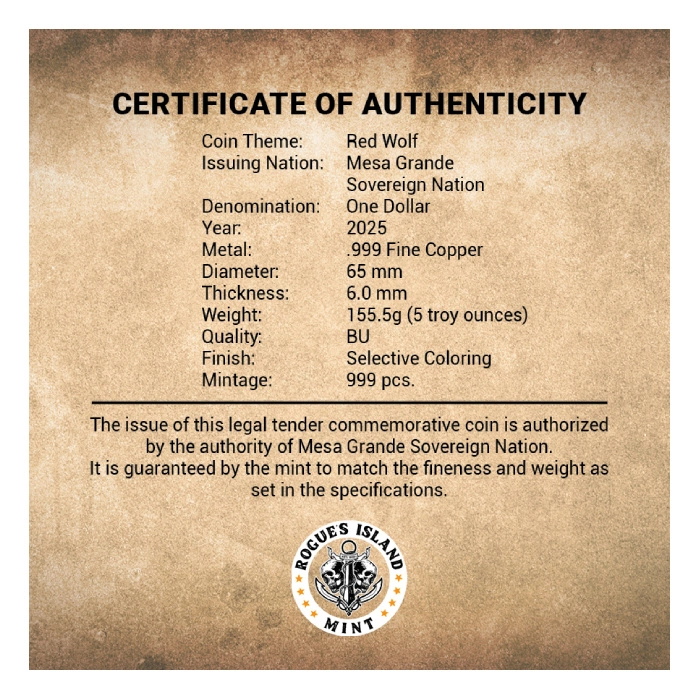 Mesa Grande Sovereign: Red Wolf kolorowany 5 uncji Miedzi 2025 w kapslu