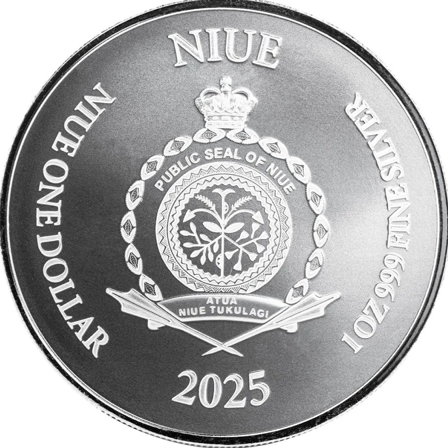 Awers zawiera herb Niue wraz z informacjami dotyczącymi masy i próby srebra, potwierdzającymi autentyczność i status prawny monety.