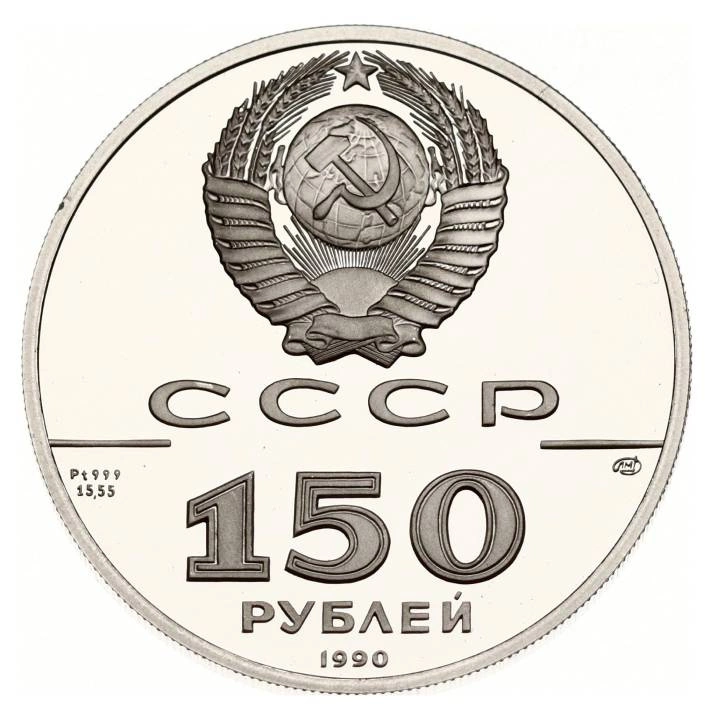 Awers zawiera godło Związku Radzieckiego – sierp i młot na tle globu z kłosami zboża, otoczone napisem СССР (ZSRR), nominałem 150 rubli i rokiem emisji 1990. W lewym polu widnieje oznaczenie zawartości i czystości platyny, a na rancie obecnych jest 240 ząbków.