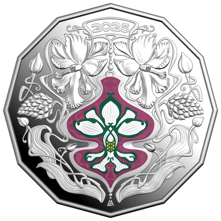 Rewers przedstawia stylizowaną kompozycję orchidei Calanthe triplicata w kolorowym wydaniu inspirowanym stylem secesyjnym. Projekt L. Ashe nadaje monecie charakter świątecznej dekoracji, z motywami liści i pąków dopełniającymi całość.
