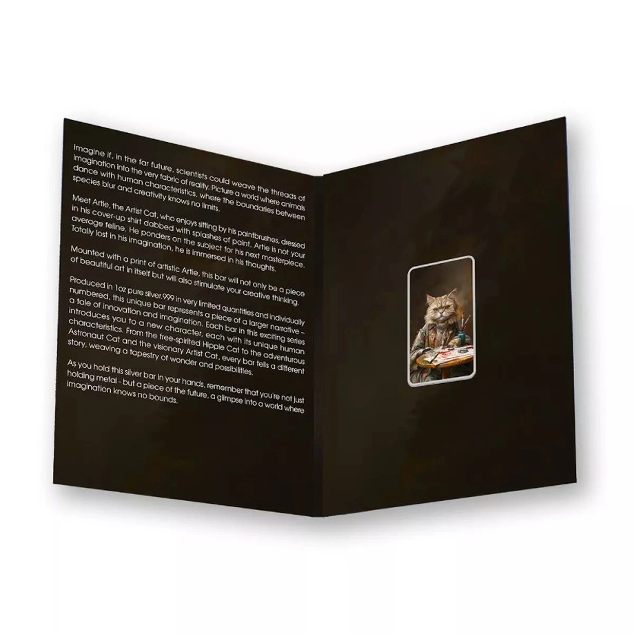 Sztabka The Holy Land Mint - Human Cats - Artie kolorowana 1 uncja Srebra 2025 to wyjątkowa odsłona z serii Human Cats, przedstawiająca Artiego – kreatywnego Kota Artystę. W swojej pracowni, otoczony narzędziami malarskimi i odziany w farbowaną koszulę, Artie oddaje się pasji tworzenia. Każdy jego ruch to akt wyrażenia wewnętrznego świata i nieograniczonej wyobraźni.