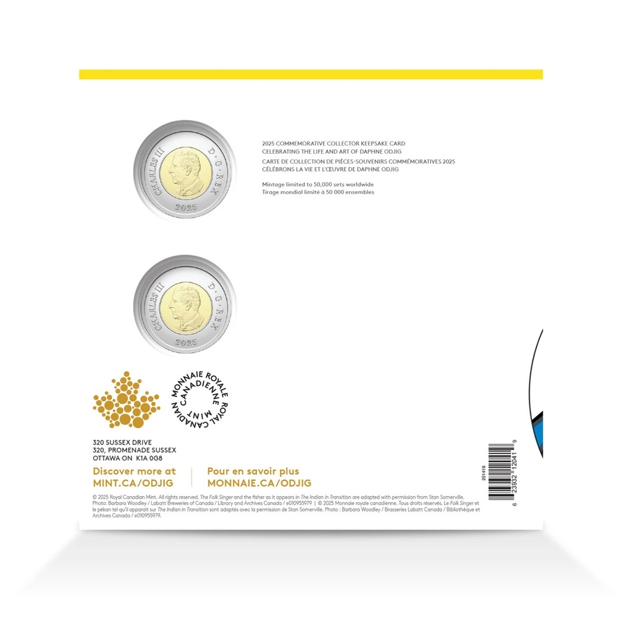 Karta Celebrating The Life And Art Of Daphne Odjig wydana jest w limitowanym nakładzie 50 000 sztuk i opatrzona certyfikatem autentyczności. Dzięki dwóm monetom i starannie opracowanej oprawie, zestaw stanowi wyjątkową pamiątkę artystycznego dziedzictwa Daphne Odjig oraz nowoczesną formę upamiętnienia jej wkładu w kanadyjską kulturę.