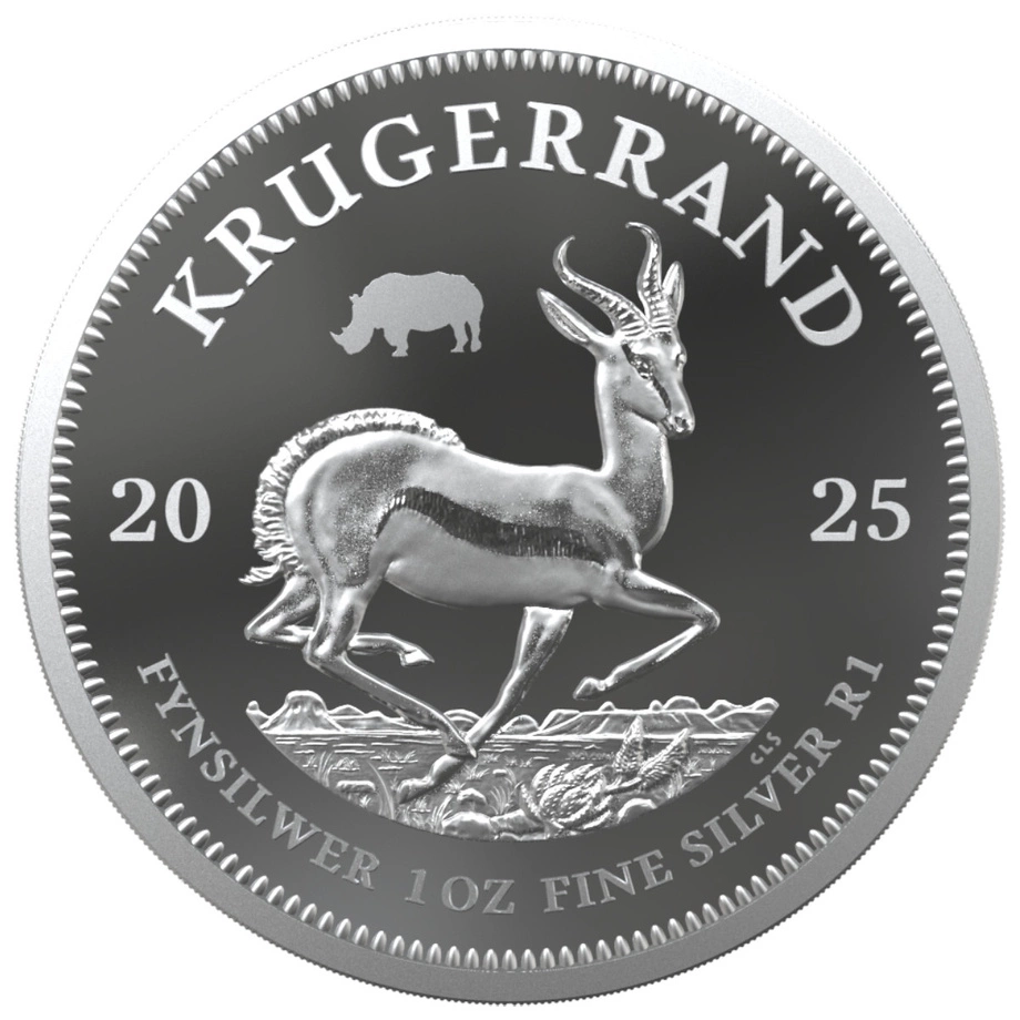 Rewers Krugerranda ukazuje biegnącą antylopę springbok, a tuż obok widoczny jest subtelny znak Rhino Privy Mark – nosorożec, wyróżniający tę edycję. Dodatkowo znajdują się tam dane: masa, próba, rok emisji 2025 oraz wartość 1 R.