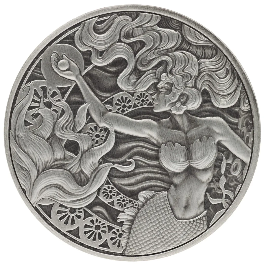 Samoa: Mermaid & Pearl 1 uncja Srebra 2025 Antiqued Coin