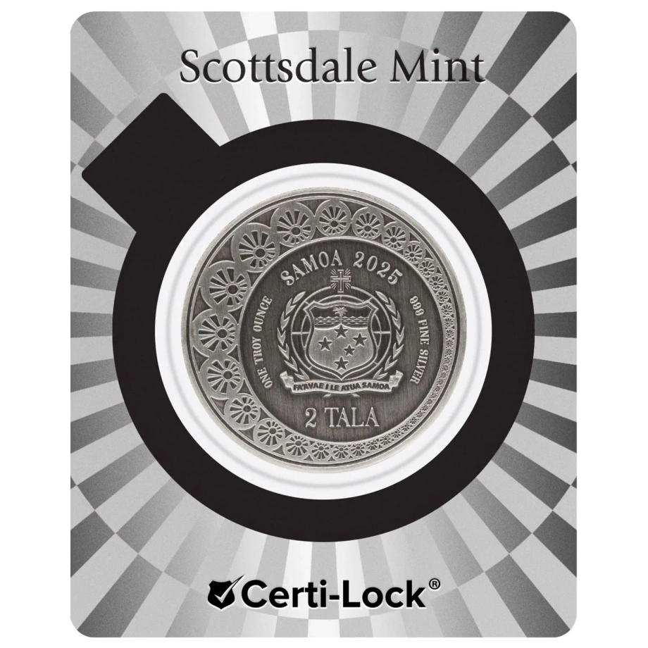 Awers zawiera herb Samoa oraz informacje o roku emisji – 2025, wartości nominalnej – 2 Tala i parametrach technicznych monety. Układ graficzny jest spójny i elegancki, co podkreśla oficjalny charakter emisji.