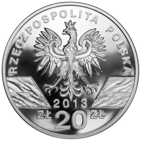 Awers monety polskiej zawiera orła w koronie, napis „RZECZPOSPOLITA POLSKA”, rok 2013 oraz wartość nominalną 20 zł.