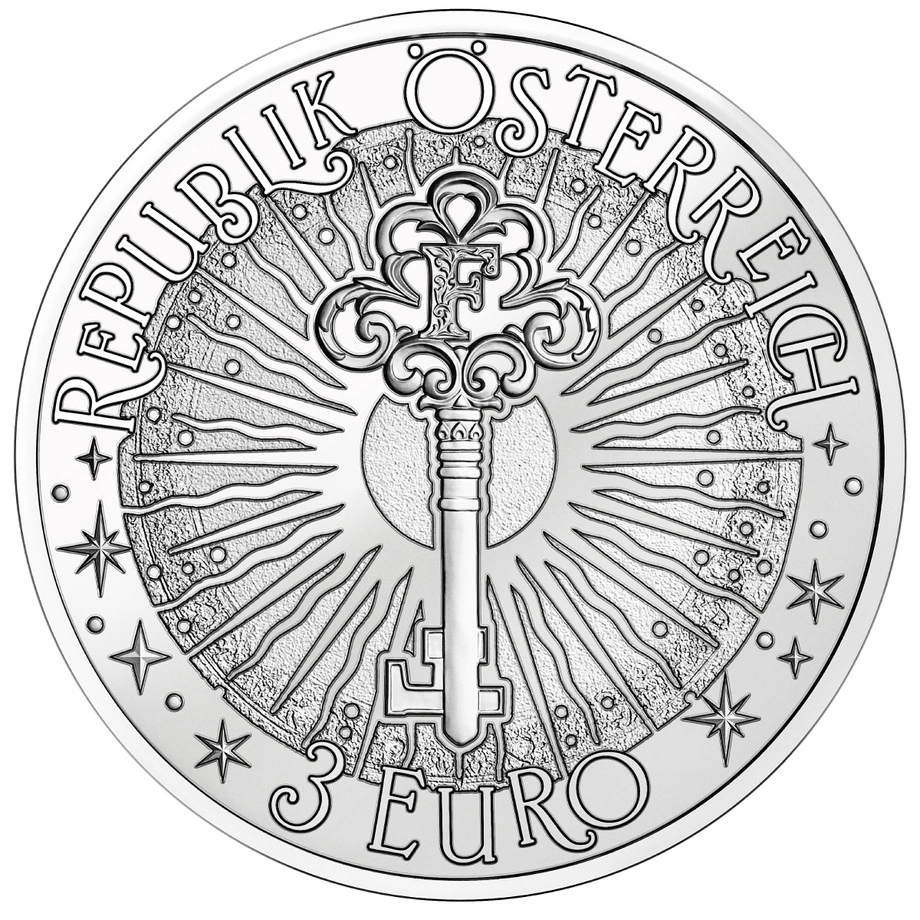 Awers ozdobiono motywem klucza o bogato zdobionej rękojeści, w której znajduje się litera „F” – znak rozpoznawczy serii. W tle widnieje reliefowe słońce o subtelnej fakturze, a wzdłuż obrzeży rozmieszczono napisy „REPUBLIK ÖSTERREICH” oraz „3 EURO”, uzupełnione stylizowanymi gwiazdami.