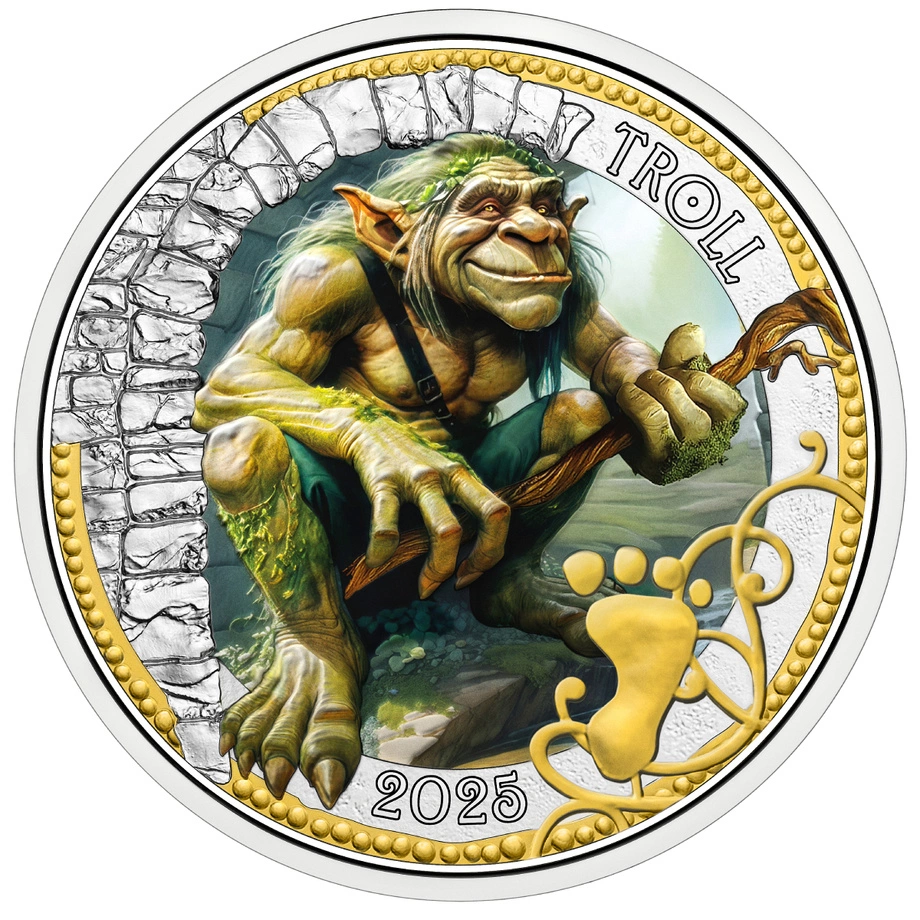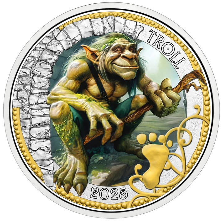 Rewers ukazuje dynamiczny wizerunek trola, którego sylwetka częściowo wychodzi poza pole monety. W tle widoczny jest fragment kamiennego mostu wykonany w reliefie, a w dolnej części złocony ornament w kształcie czteropalczastej stopy. Kompozycję uzupełnia złoty pas nadruku oraz napisy „TROLL” i „2025”, umieszczone w górnej i dolnej części monety. Efekt pod lampą UV potęguje wrażenie ruchu i głębi.
