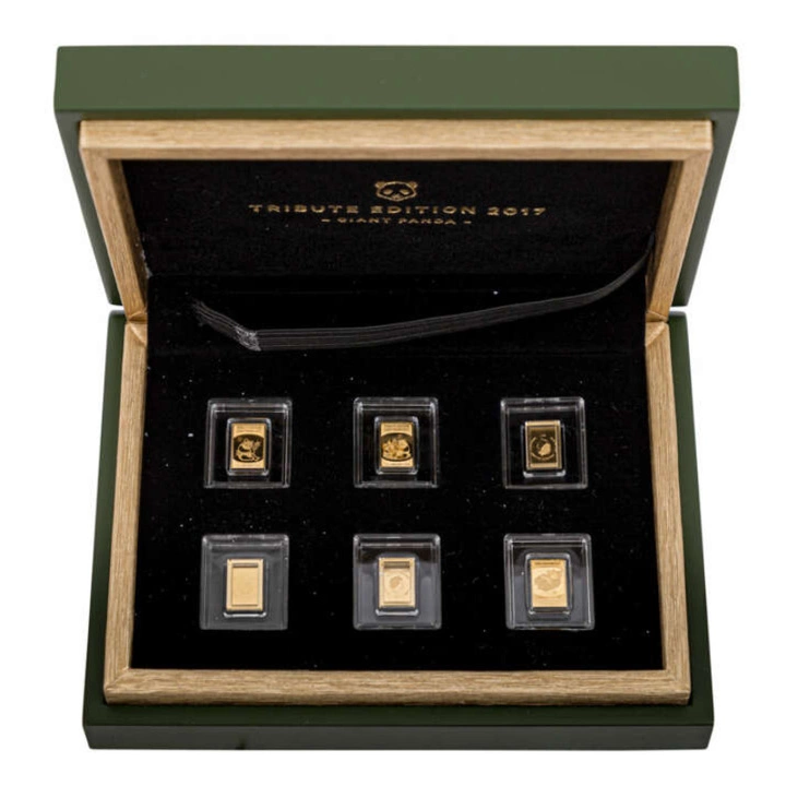 Rewers prezentuje sześć różnych przedstawień pandy, z umieszczonym na górze napisem TRIBUTE EDITION GIANT PANDA 2017 oraz danymi dotyczącymi wagi i próby złota u dołu. Każda sztabko-moneta posiada odmienny motyw graficzny, co nadaje zestawowi wyjątkowego charakteru i wysokiej wartości kolekcjonerskiej.