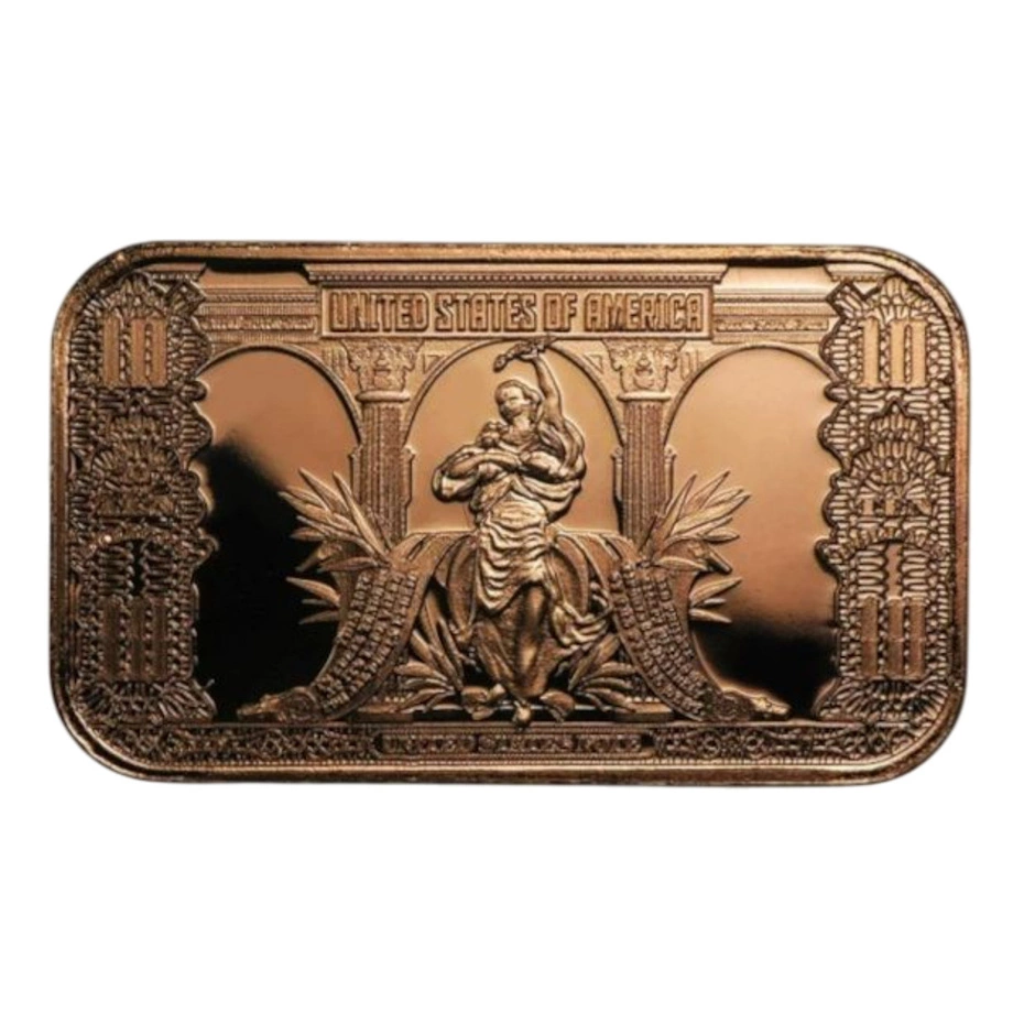 Sztabka $10 US Buffalo Banknote 1 uncja miedzi przenosi na metal projekt jednego z najbardziej rozpoznawalnych amerykańskich banknotów. Dziesięciodolarowy „Bison Note” z 1901 roku był prawnym środkiem płatniczym w systemie United States Notes, a jego kompozycja łączyła bizona – symbol prerii – z portretami uczestników ekspedycji badającej zakup Luizjany. Sztabka wykonana jest z miedzi próby 999 i waży 1 uncję AVDP (28,349 g). Wyraźny relief uwydatnia detal zarówno repliki wzoru jak i specyfikacji technicznej sztabki.