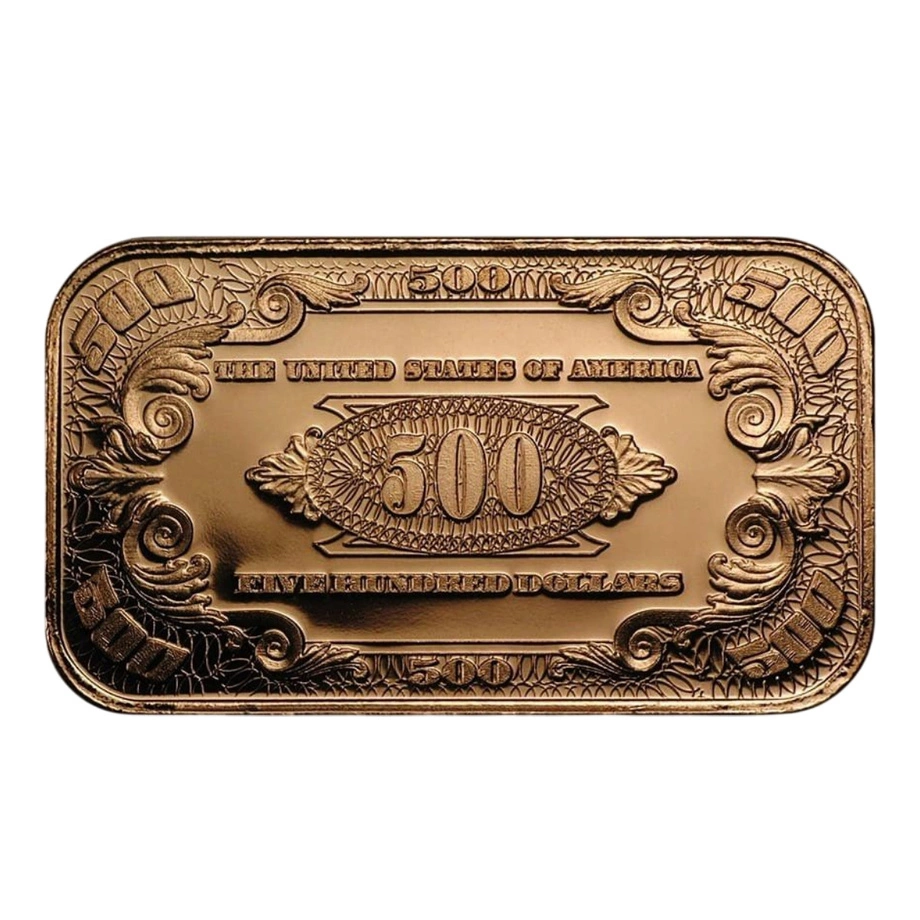 Sztabka $500 US William McKinley Banknote 1 uncja miedzi honoruje ikonę amerykańskiej waluty o wysokim nominale. Wzór oparto na banknocie 500 dolarów, którego centralnym motywem był portret prezydenta McKinleya. Sztabka została wybita z miedzi próby 999, w masie 1 uncji AVDP (28,349 g). Banknoty 500 USD powstały z myślą o dużych rozliczeniach bankowych; z obiegu zniknęły po II wojnie światowej, a ostateczne wycofanie w 1969 roku nadało im charakter kolekcjonerski. Miedziana interpretacja zachowuje układ typografii i rozbudowaną ramę giloszową oryginału.