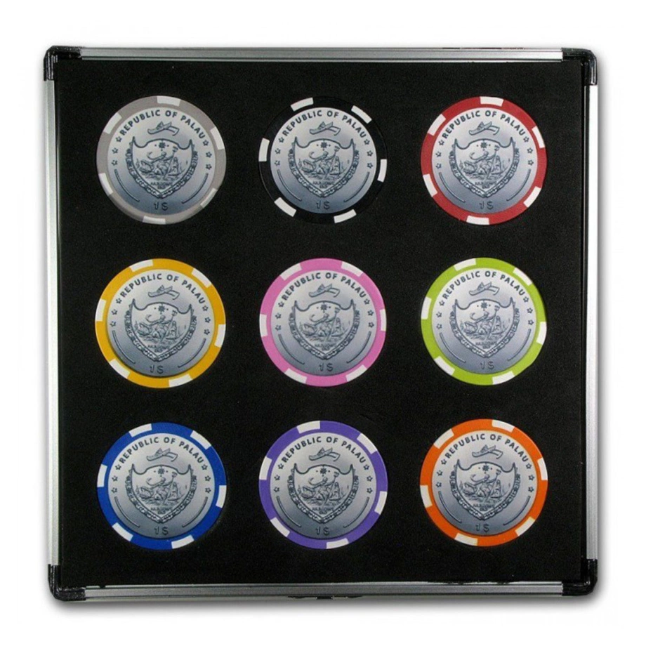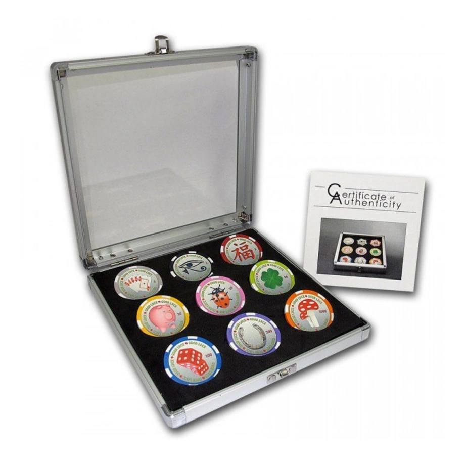 Zestaw dostarczany jest w aluminiowej kasecie z przezroczystym wiekiem, przypominającym etui do żetonów pokera, co podkreśla tematykę kolekcji. Opakowanie zapewnia bezpieczne przechowywanie oraz efektowną prezentację wszystkich dziewięciu monet. Każda moneta umieszczona jest przeznaczonym do tego schowku. Do zestawu dołączony jest certyfikat autentyczności autoryzowany przez Ministerstwo Finansów Republiki Palau. Dla kolekcjonerów poszukujących niezwykłych, tematycznych emisji o ograniczonym nakładzie stanowi to doskonałą pozycję łączącą wartość numizmatyczną z artystycznym wyrazem motywów szczęścia.