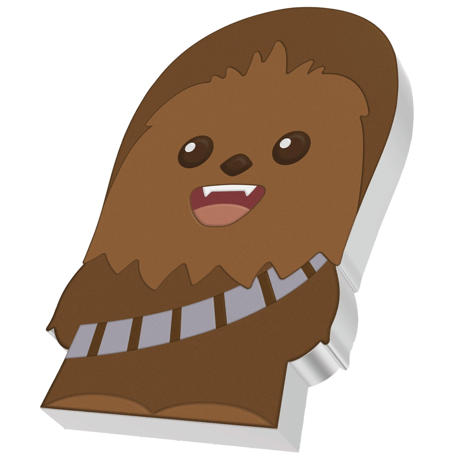 Chewbacca Chibi Coin kolorowany 1 uncja Srebra 2020 Proof to emisja wchodząca w skład serii Star Wars – Chibi Coins. Przedstawia Chewbaccę w typowej stylistyce chibi, z dużą głową i proporcjonalnie mniejszym ciałem, co nadaje wizerunkowi urokliwy, humorystyczny charakter. Moneta została wybita z jednej uncji 99,9% srebra w jakości proof przez New Zealand Mint. Nakład ograniczono do 2 000 sztuk na świecie, a każdy egzemplarz dostarczany jest w oryginalnym pudełku z dołączonym certyfikatem autentyczności.