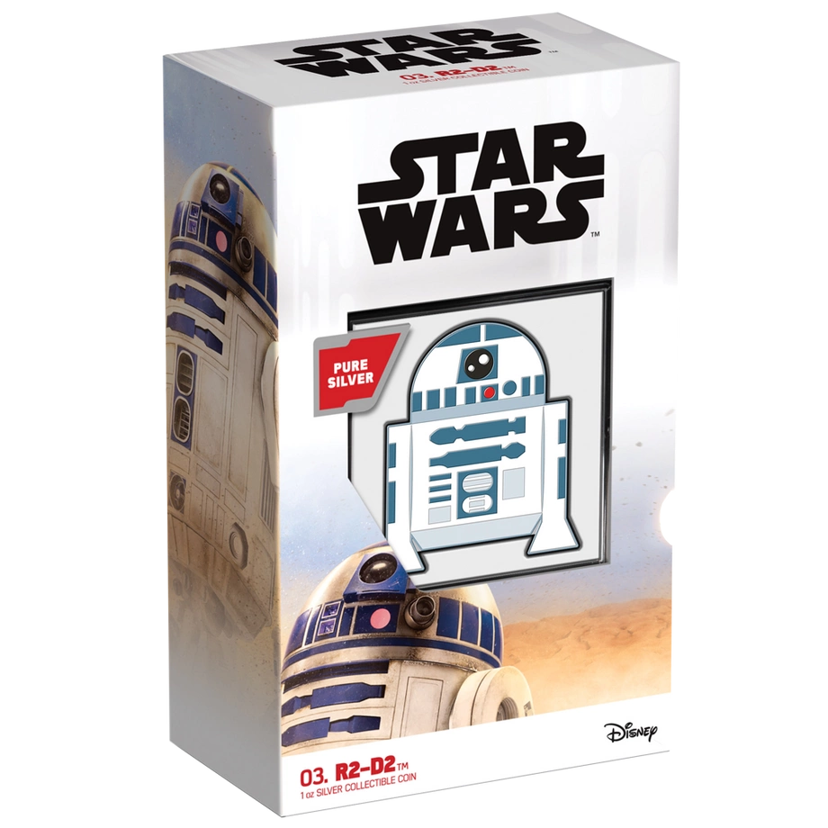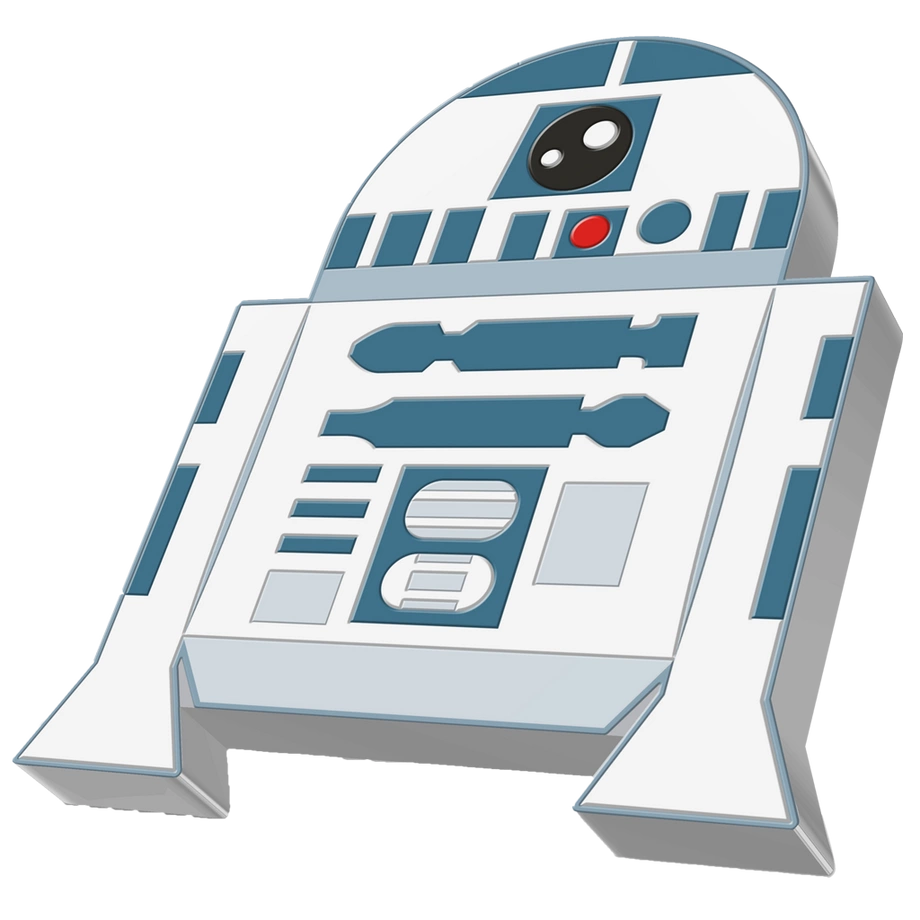 R2D2 Chibi Coin kolorowany 1 uncja Srebra 2020 Proof to numizmat należący do serii Star Wars – Chibi Coins. Przedstawia postać R2D2 w charakterystycznej estetyce chibi, z dużą głową i proporcjonalnie mniejszym tułowiem, co nadaje całości wdzięczny i humorystyczny charakter. Moneta została wybita przez New Zealand Mint z jednej uncji srebra próby 99,9% w jakości proof. Emisję ograniczono do 2 000 egzemplarzy na świecie, a każdy egzemplarz dostarczany jest w oryginalnym pudełku wraz z certyfikatem autentyczności.