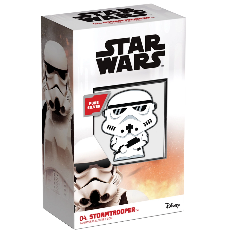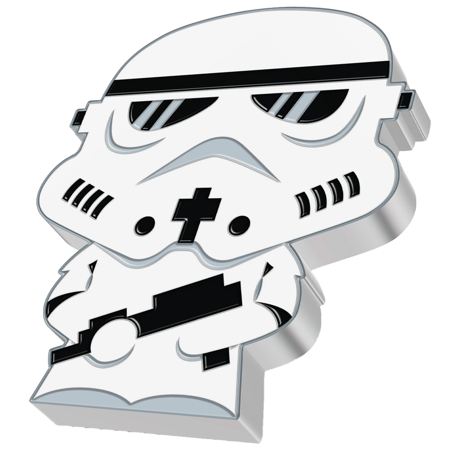 Stormtrooper Chibi Coin kolorowany 1 uncja Srebra 2020 Proof to emisja należąca do serii Star Wars – Chibi Coins. Upamiętnia postać szturmowca ukazaną w typowej stylistyce chibi, z wyraźnie powiększoną głową i proporcjonalnie mniejszym ciałem, co nadaje jej urokliwy i figlarny charakter. Moneta wybita została z jednej uncji srebra o czystości 99,9% w jakości proof przez New Zealand Mint. Nakład ograniczono do 2 000 egzemplarzy na świecie, a każdy egzemplarz dostarczany jest w oryginalnym pudełku z dołączonym certyfikatem autentyczności.
