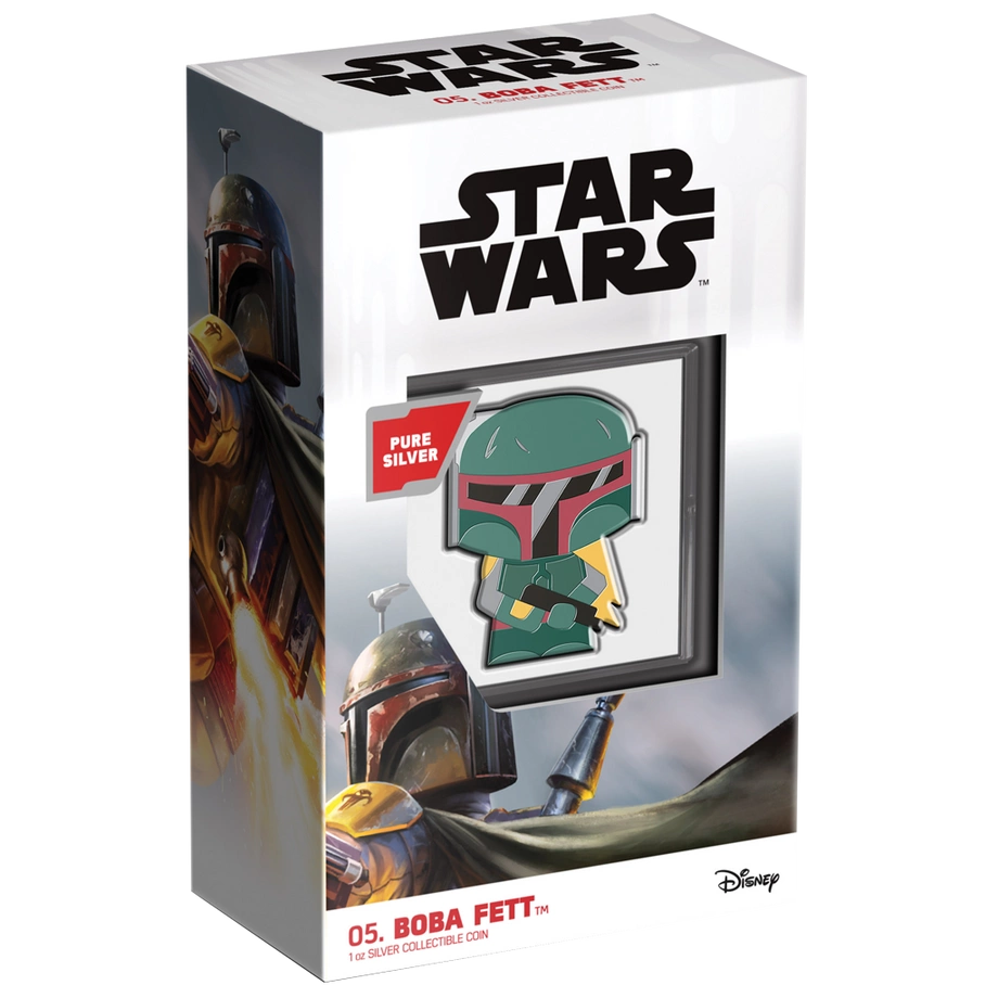 Seria Star Wars obejmuje kultowe filmy science fiction stworzone przez George’a Lucasa, które zdobyły miliony fanów na całym świecie. Boba Fett, legendarny łowca nagród, należy do najbardziej rozpoznawalnych bohaterów uniwersum, a jego charakterystyczna zbroja i hełm stały się ikonami popkultury. Moneta Chibi pozwala kolekcjonerom i miłośnikom sagi w nowatorski sposób uhonorować tę wyjątkową postać.