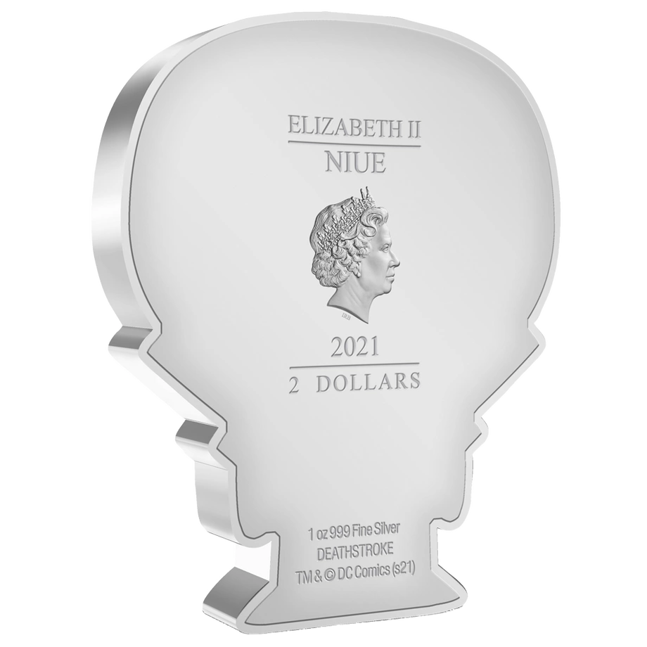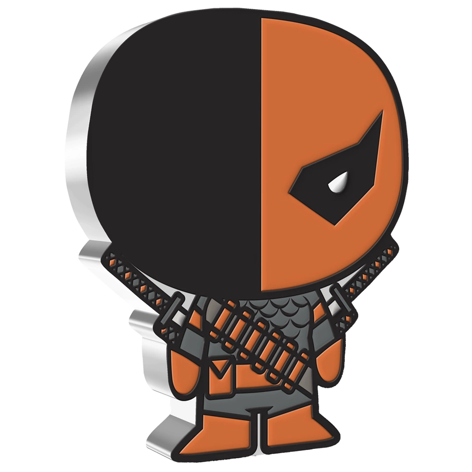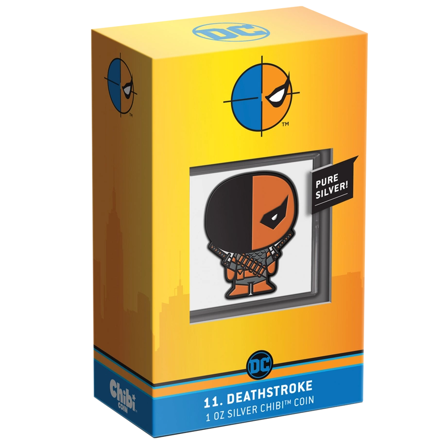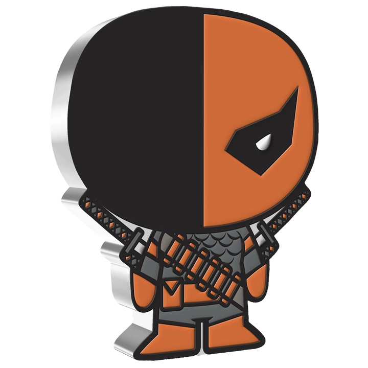 Deathstroke Chibi Coin kolorowany 1 uncja Srebra 2021 Proof to emisja z kolekcji DC Comics – Chibi Coins. Projekt celebruje postać Deathstroke ujętą w konwencji Chibi, z przeskalowaną, dużą głową i proporcjonalnie mniejszym ciałem, co nadaje figurze przyjazny, humorystyczny charakter. Moneta została wybita z jednej uncji srebra próby 99,9% w jakości proof przez New Zealand Mint. Nakład ograniczono do 2 000 sztuk na cały świat, a każdy egzemplarz dostarczany jest w oryginalnym pudełku wraz z certyfikatem autentyczności.