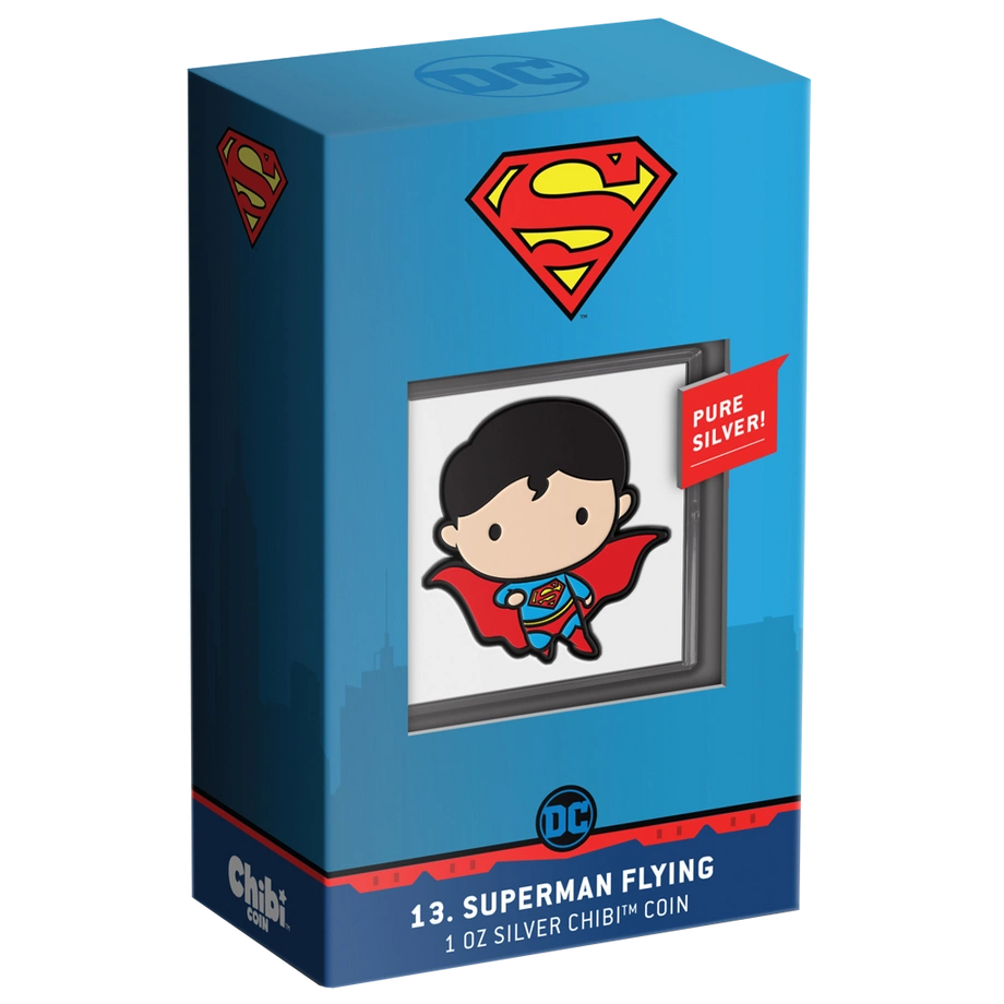 Superman Flying Chibi Coin kolorowany 1 uncja Srebra 2021 Proof to emisja z serii DC Comics – Chibi Coins. Projekt ukazuje Supermana w estetyce chibi, z dużą głową i proporcjonalnie mniejszym ciałem, co nadaje postaci urokliwy i figlarny charakter. Moneta została wybita z jednej uncji srebra próby 99,9% w standardzie proof przez New Zealand Mint. Nakład ograniczono do 2 000 sztuk na całym świecie, a każdy egzemplarz dostarczany jest w oryginalnym pudełku z dołączonym certyfikatem autentyczności.
