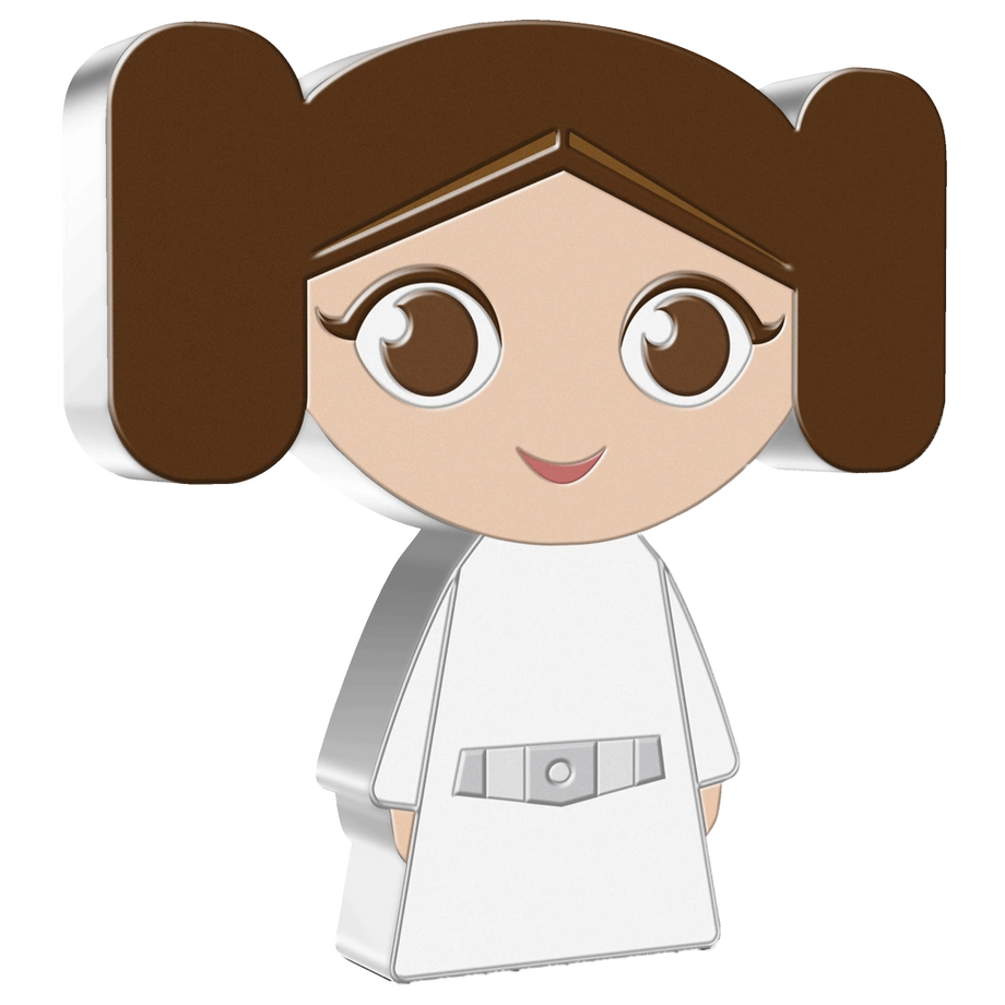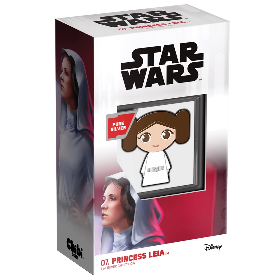 Princess Leia Chibi Coin kolorowany 1 uncja Srebra 2021 Proof to kolekcjonerska moneta należąca do serii Star Wars – Chibi Coins. Ukazuje księżniczkę Leię w rozpoznawalnej stylistyce chibi, z dużą głową i niewielkim tułowiem, co nadaje bohaterce ujmujący, zabawny charakter. Została wybita z jednej uncji czystego srebra próby 999 w jakości proof przez New Zealand Mint. Emisję ograniczono do 2 000 sztuk, a każdy egzemplarz dostarczany jest w oryginalnym opakowaniu z dołączonym certyfikatem autentyczności.