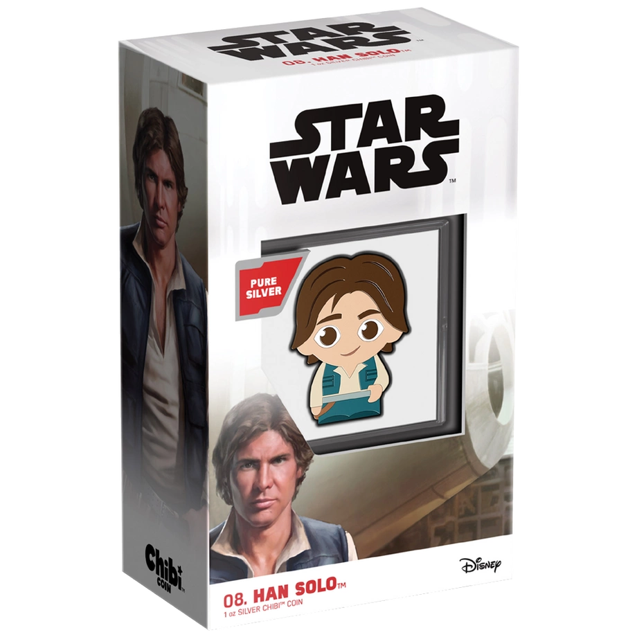 Han Solo Chibi Coin kolorowany 1 uncja Srebra 2021 Proof to kolekcjonerska moneta z serii Star Wars – Chibi Coins. Ukazuje Hana Solo w stylu chibi, z wyraźnie powiększoną głową i niewielkim korpusem, co nadaje postaci figlarnego i sympatycznego charakteru. Numizmat wybity został z jednej uncji czystego srebra próby 999, w jakości proof, przez New Zealand Mint. Emisja ograniczona jest do 2 000 egzemplarzy na cały świat, a każda sztuka dostarczana jest w oryginalnym pudełku wraz z certyfikatem autentyczności.
