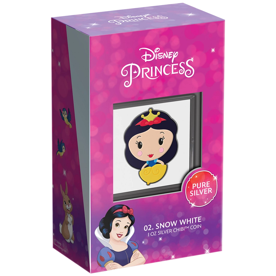 Snow White Chibi Coin kolorowany 1 uncja Srebra 2021 Proof to numizmat wprowadzony w ramach serii Disney – Chibi Coins. Moneta przedstawia Królewnę Śnieżkę w konwencji Chibi, z wyraźnie powiększoną głową i proporcjonalnie mniejszym ciałem, co nadaje projektowi pogodny, uroczy charakter. Została wybita z jednej uncji srebra próby 99,9% w standardzie proof przez New Zealand Mint. Nakład ograniczono do 2 000 egzemplarzy na świecie, a każdy egzemplarz dostarczany jest w oryginalnym pudełku z certyfikatem autentyczności.