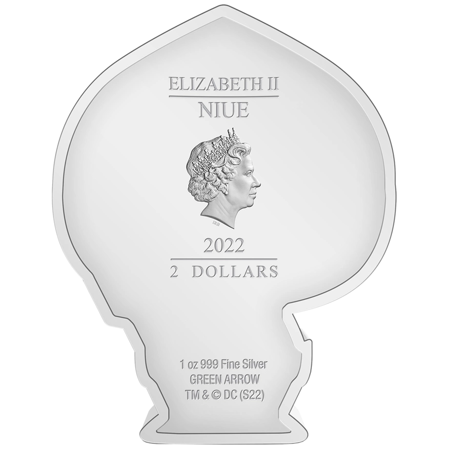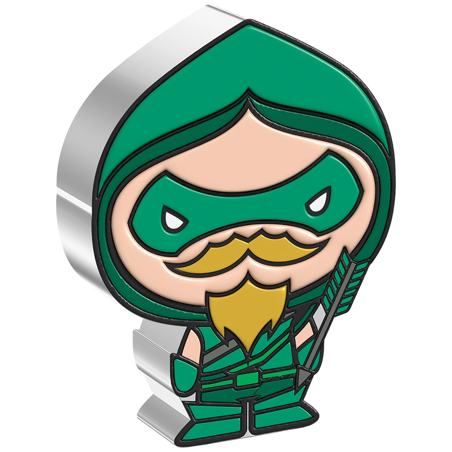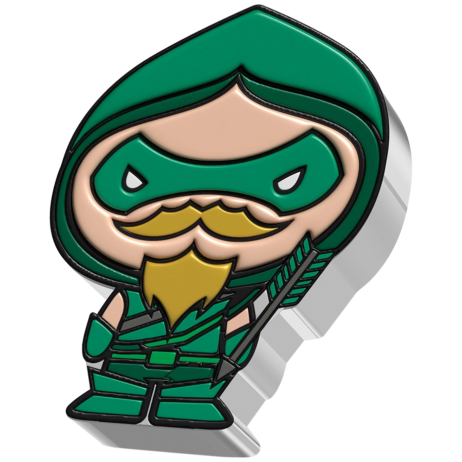 Rewers ukazuje Green Arrow w ujęciu chibi, z przerysowanymi proporcjami i charakterystyczną ekspresją, podkreślając jego unikalny charakter oraz atrakcyjność monety dla fanów i kolekcjonerów.