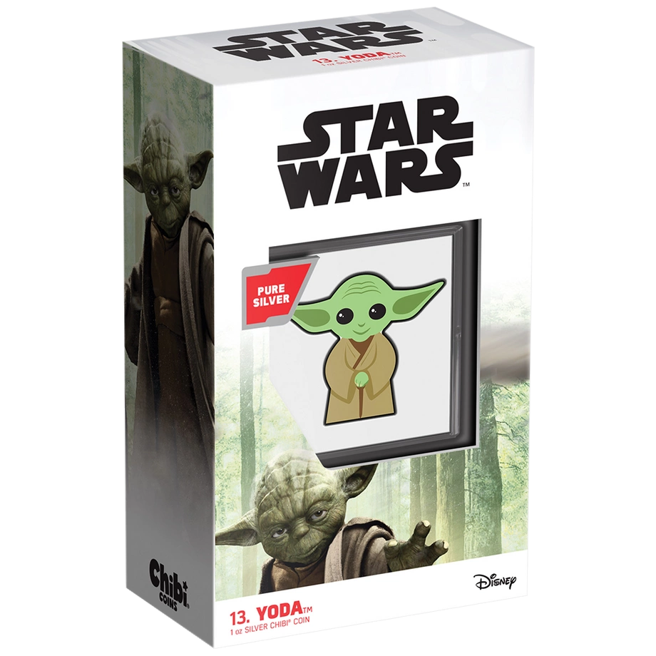 Yoda Chibi Coin kolorowany 1 uncja Srebra 2022 Proof to kolekcjonerska moneta z serii Star Wars – Chibi Coins. Ukazuje mistrza Jedi Yodę w charakterystycznej stylistyce Chibi, z dużą głową i proporcjonalnie mniejszym ciałem, co nadaje całości pogodny, zabawny wygląd. Egzemplarz wybity został przez New Zealand Mint z jednej uncji srebra próby 99,9% w standardzie proof. Emisję ograniczono do 2 000 sztuk na cały świat, a każda moneta dostarczana jest w oryginalnym pudełku z dołączonym certyfikatem autentyczności.