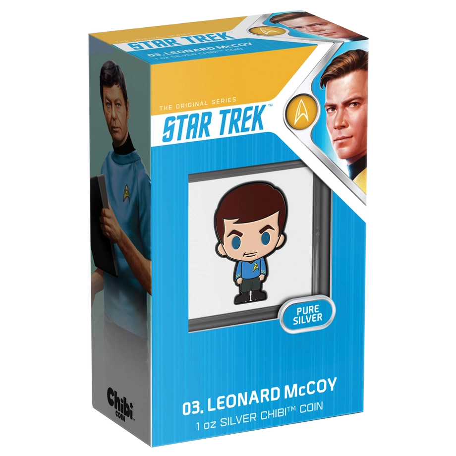 Leonard McCoy Chibi Coin kolorowany 1 uncja Srebra 2022 Proof to moneta należąca do serii Chibi Coins. Przedstawia postać doktora McCoya z kultowego uniwersum Star Trek w stylu chibi, wyróżniającym się dużą głową i proporcjonalnie mniejszym ciałem, co nadaje projektowi urokliwy, zabawny charakter. Egzemplarz wybito z jednej uncji srebra próby 99,9% w jakości proof przez New Zealand Mint. Emisję ograniczono do 2 000 sztuk na całym świecie, a każda moneta trafia do nabywcy w oryginalnym pudełku wraz z certyfikatem autentyczności.