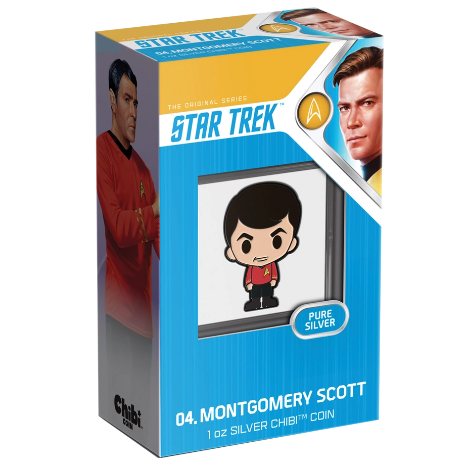 Montgomery Scott Chibi Coin kolorowany 1 uncja Srebra 2022 Proof to kolekcjonerska moneta z serii Chibi Coins. Ukazuje inżyniera Montgomery'ego Scotta, znanego jako „Scotty”, z kultowego świata Star Trek w charakterystycznej stylistyce Chibi, gdzie duża głowa i proporcjonalnie mniejsze ciało nadają postaci urokliwy i zabawny charakter. Egzemplarz wybito z jednej uncji srebra próby 99,9% w jakości proof przez New Zealand Mint. Emisja ograniczona jest do 2 000 sztuk na całym świecie; każda moneta dostarczana jest w oryginalnym opakowaniu wraz z certyfikatem autentyczności.
