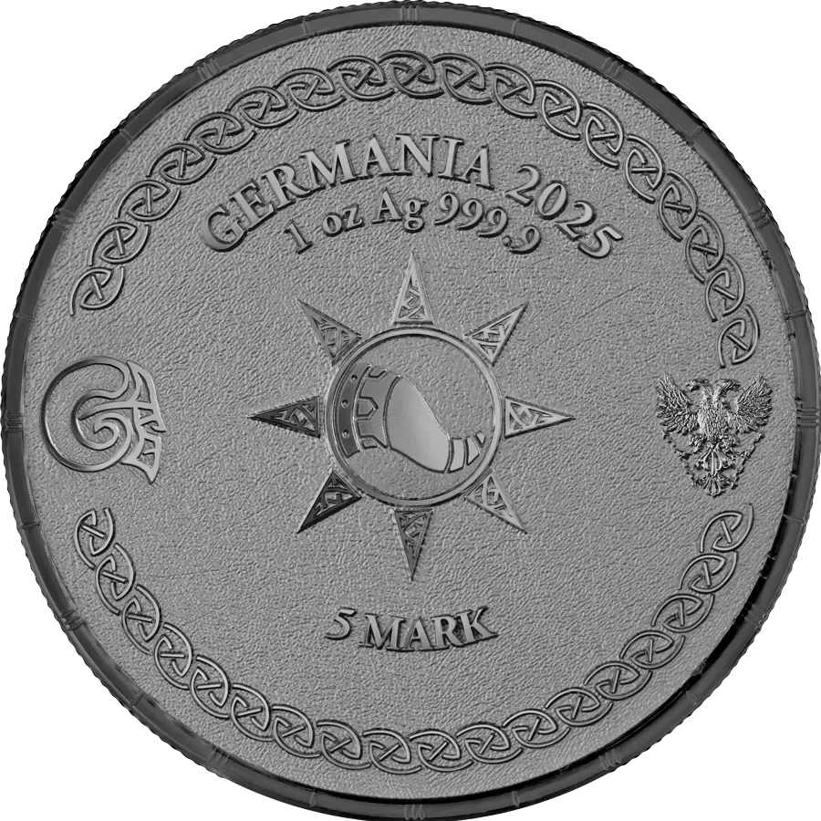 Rewers prezentuje symboliczny róg Heimdalla oraz dwugłowego orła, znak rozpoznawczy Germania Mint, który nawiązuje do tradycji menniczej i podkreśla wizualną siłę emisji.