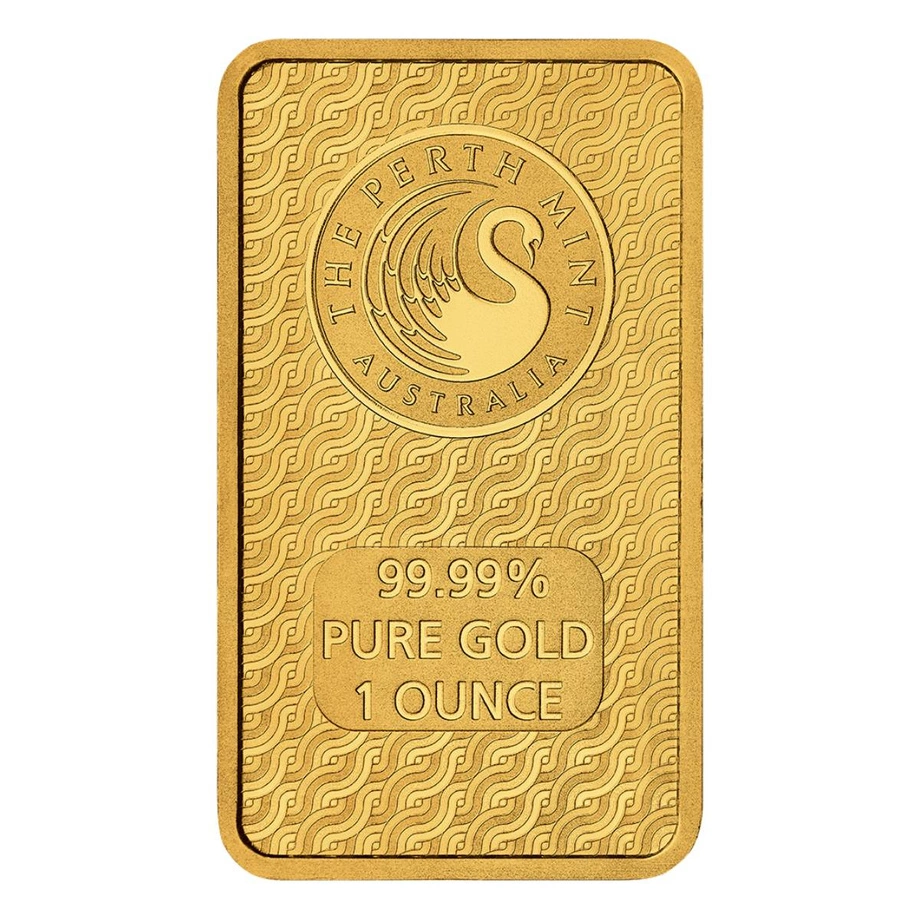 Awers zdobi okrągłe logo The Perth Mint ze stylizowanym łabędziem oraz napisem „THE PERTH MINT AUSTRALIA” w otoku. Poniżej umieszczono prostokątne pole z wypukłym napisem „99.99% PURE GOLD 1 OUNCE”, wskazującym próbę kruszcu i nominalną zawartość złota. Kompozycję zamyka ramka z zaokrąglonymi narożnikami, a tło pokrywa powtarzalny mikrofalowy wzór pełniący również funkcję zabezpieczenia przed fałszerstwem.